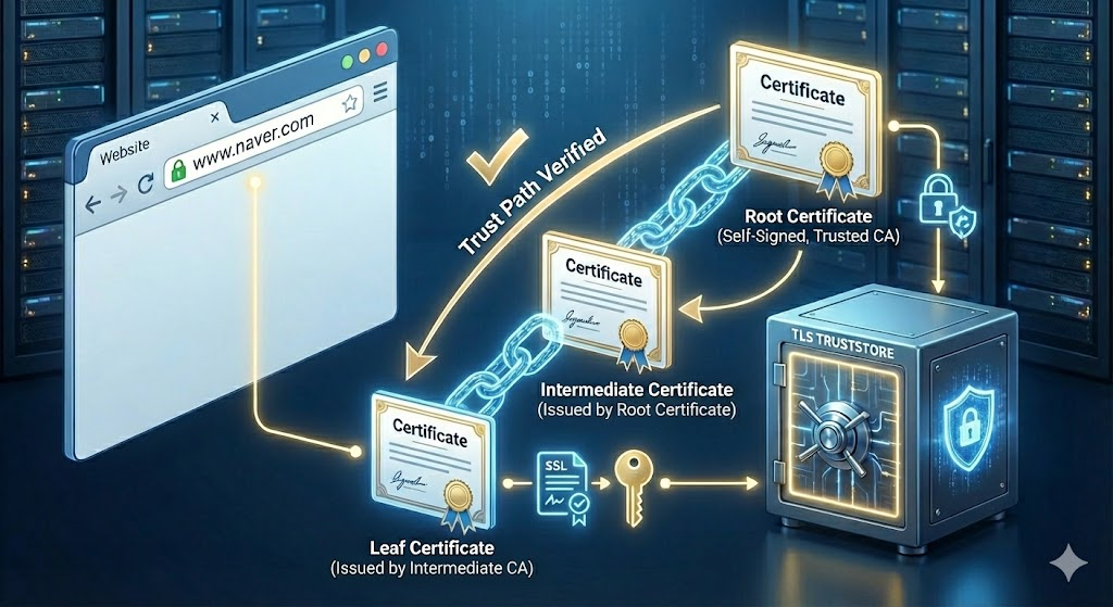 - Leaf 인증서 : 실제 도메인(예: www.naver.com)에 대해 발급된 최종 사용자용 인증서