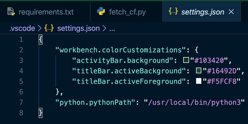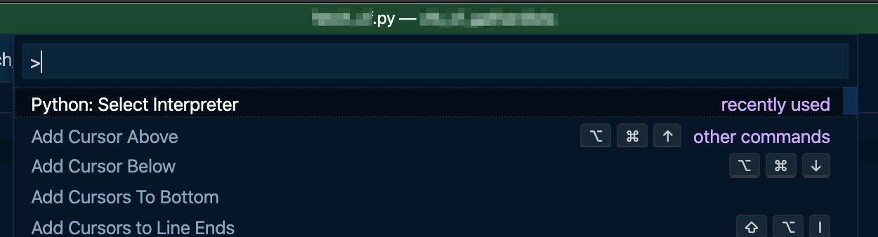 이렇게 하면 vscode 에서 거슬리는 unresolved import warning 을 없앨 수 있습니다. 이렇게 지정한 Python 경로는 vscode 의 개별 과제별 환경 파일인 .vscode 경로 하위의 settings.json 에 기록됩니다. 거꾸로 얘기하면 이 파일을 직접 수정해도 동일한 효과를 얻을 수 있다는 말입니다. 저라면 Cmd + Shift + P 를 이용하는 방법을 계속 쓸 것 같습니다 ㅎㅎ