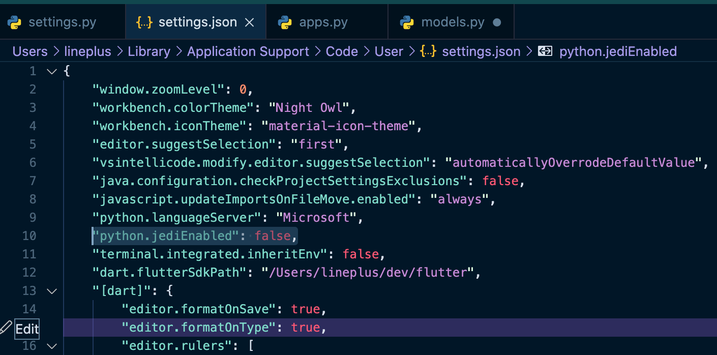 이때 열리는 settings.json 파일은 프로젝트와 관련된 파일이 아니고 Visual Studio Code 의 언어별 기본 설정입니다. 이 파일의 내용들 중 인텔리센스와 관련된 항목을 발견할 수 있는데요, 이 항목을 과감히 삭제하고 저장해 줍니다. 제 경우에는 "python.jediEnabled" 항목을 통째로 날려주었습니다 :-)