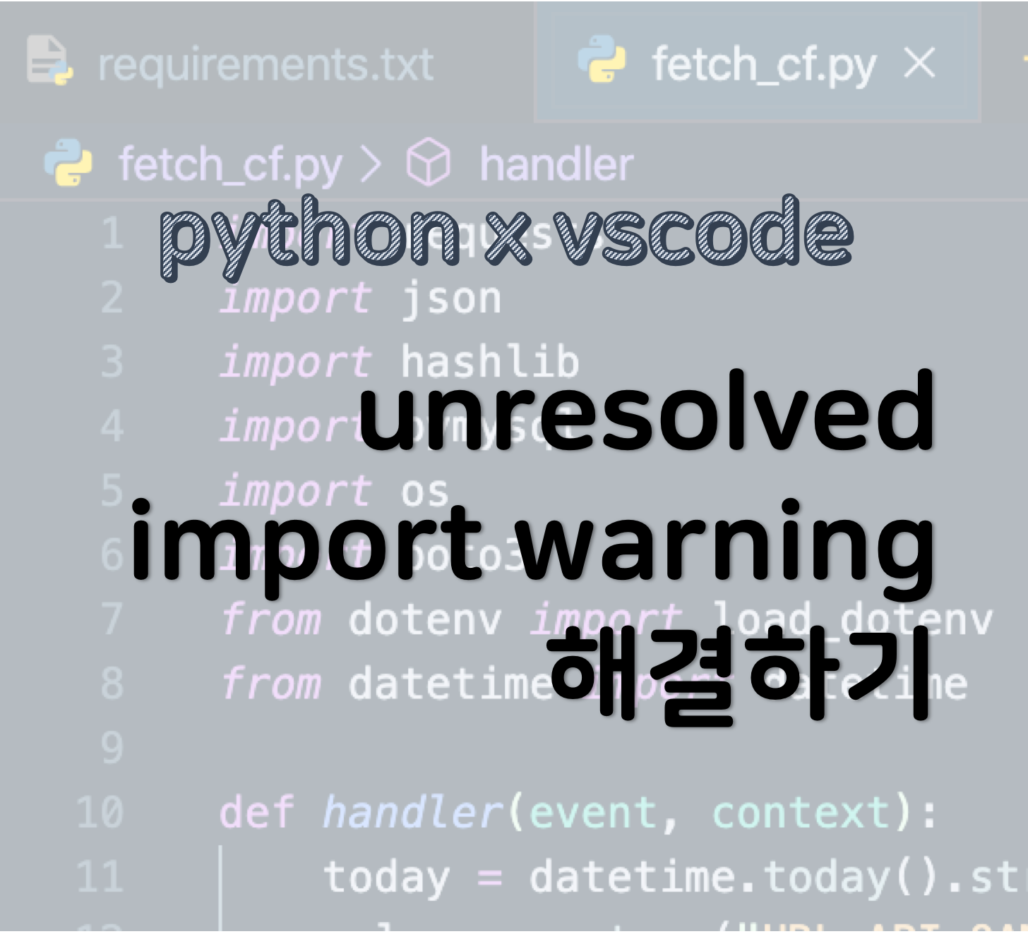 근래에 회사에서 제공하는 함수형 플랫폼을 사용하려다보니 (AWS 의 람다와 무척 비슷합니다) Python 을 사용할 일이 조금 생기고 있습니다. 본격적으로 다뤄본 언어도 아니고 개발환경도 익숙하지 않아 시행착오가 많이 생기고 있습니다. 오늘 만난 문제는 Visual Studio Code 에서 Python 을 사용할 때 발생하는 Unresolved Import Error 에 대한 이야기 입니다.