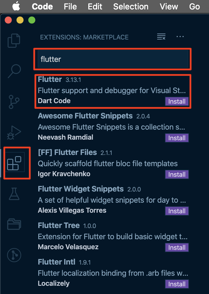 VS Code 는 특정 언어나 환경에 종속되어 있지 않기 때문에 개발하려는 언어, 환경에 따라 필요한 플러그인 혹은 확장 Extension 을 설치해 주어야 합니다. VS Code 를 먼저 실행하고 왼쪽 툴바의 다섯번째에 위치한 확장 기능을 선택하여 플러터 확장을 검색, 설치해보겠습니다. 검색어에 Flutter 를 입력하면 플러터 개발/디버그 확장이 첫번째 결과로 출력됩니다.