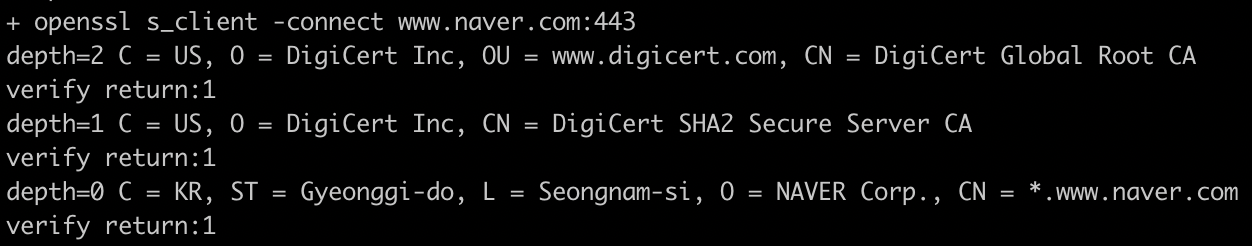 ...인증서의 발급 체계에 따라 서버 인증서, 중간 인증서, 루트 인증서의 정보를 확인할 수 있습니다. 서버 인증서에 있는 C, ST, L, O 등의 값이 브라우저에 표시되었던 정보임을 알 수 있습니다. 가장 위에 있는 루트 인증서를 보면 OU Organization Unit 라는 값이 있는데요 여기에 www.digicert.com 이라는 인증서 발급사의 도메인 정보가 들어가 있는 것을 볼 수 있습니다.