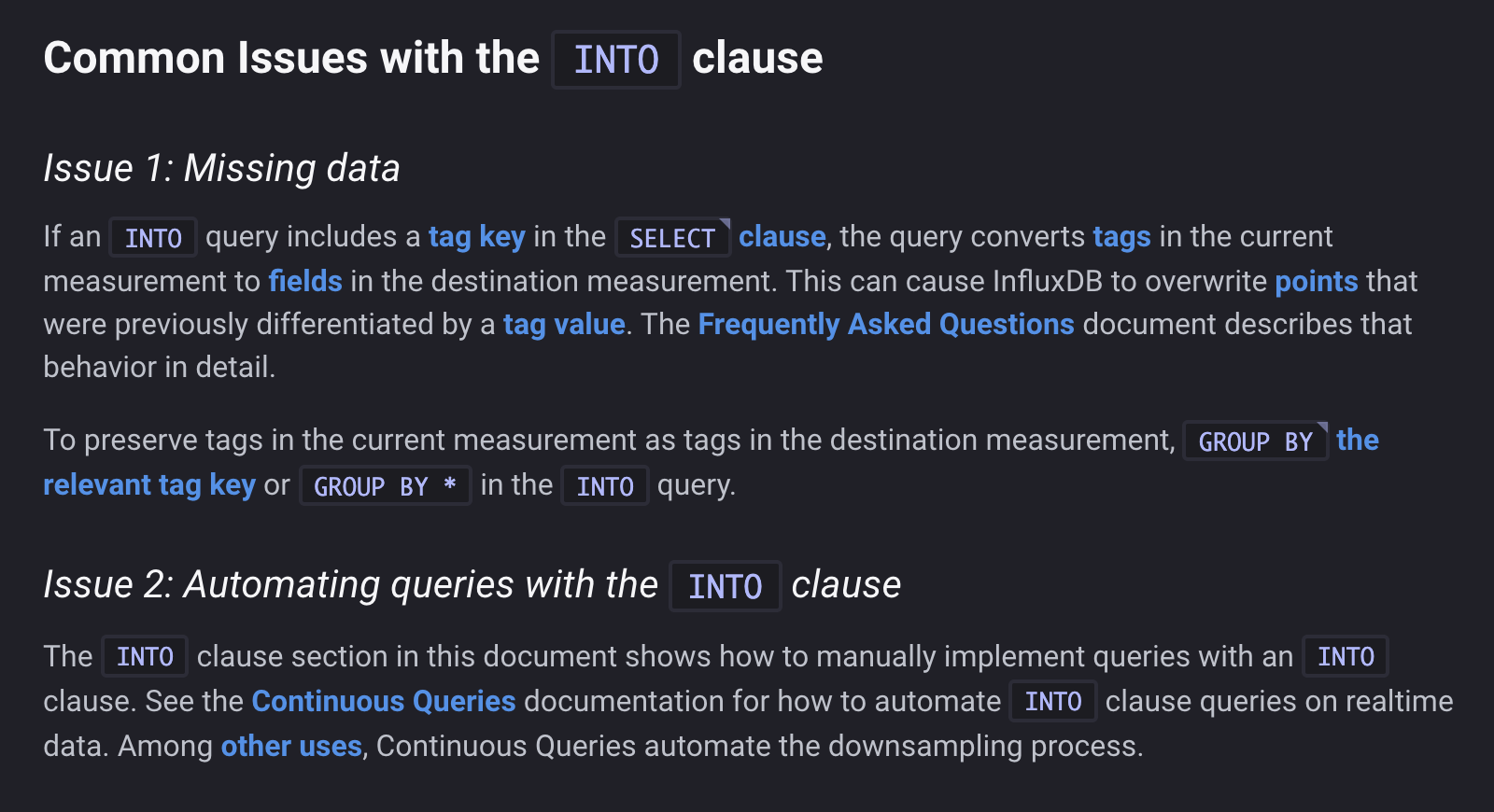 우선, influxDB 에서 <SELECT INTO> 구문을 사용하기 전에 공식 문서를 한 번 읽어보는 것을 추천드립니다. influxDB 의 공식문서가 마음에 드는 점 중 하나는 설명만 나열하는 것이 아니라 샘플 쿼리와 같은 예시가 중간중간에 소개된다는 점입니다. 설명을 읽는 것도 중요하지만 샘플을 가지고 이해하는 것이 더 좋을떄도 많기 때문이지요!