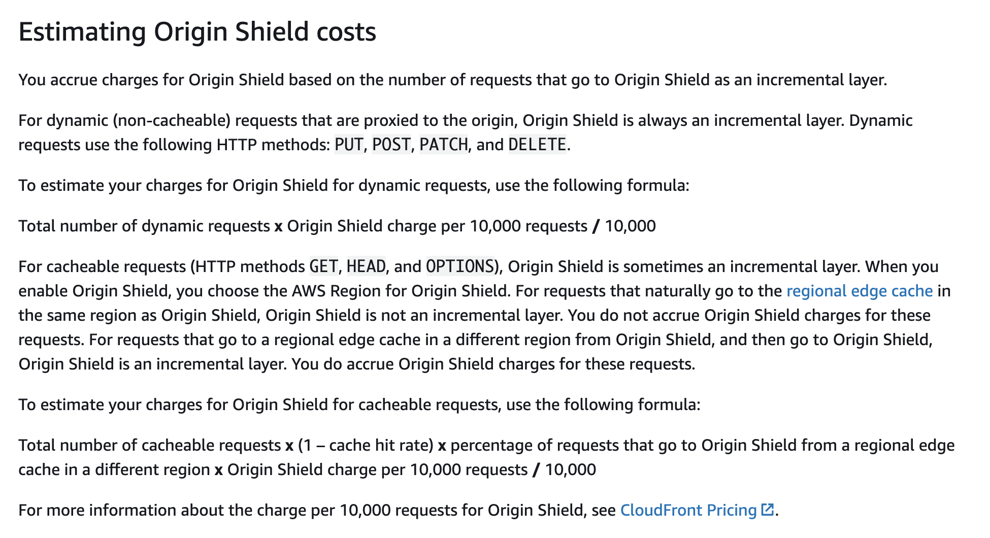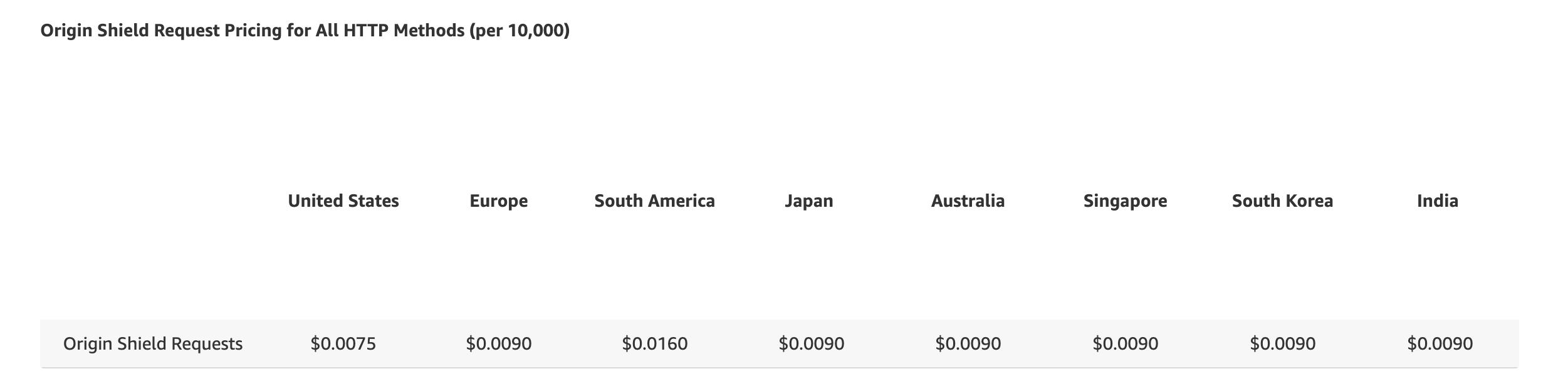 그렇다면 비용 계산은 어떻게 되는 걸까요? AWS 를 사용하면 참 편리하고 좋은 것들이 많지만 늘 걱정되는게 비용이기 때문에 비용은 확실하게 확인하고 넘어갈 필요가 있습니다. Origin Shiled 는 기본적으로 REC 이기 때문에 기존의 REC 의 가격 정책과 마찬가지로 과금을 안하는 것이 기본입니다. 다만, REC 가 요청량, 전송량 모두에 대해 별도 과금이 없는 것과 달리 Origin Shield 경유시 요청량에 대한 과금이 발생합니다. (전송량 단위의 과금은 없습니다)