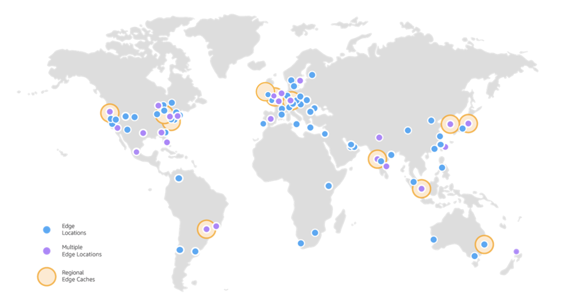AWS 에서 종종 봤을 위의 그림을 보면 Edge Location, 즉 사용자 접점의 캐시가 배치된 리전은 가능한 넓은 지역에 퍼져 있는 것을 볼 수 있습니다. 반면 오렌지색 원으로 표현된 Regional Edge Cache, 즉 상위 레이어의 캐시 혹은 2차 캐시는 특정 지역 (=보통 컴퓨팅 리전과 일치합니다) 에만 배치되어 있는 것을 볼 수 있습니다.