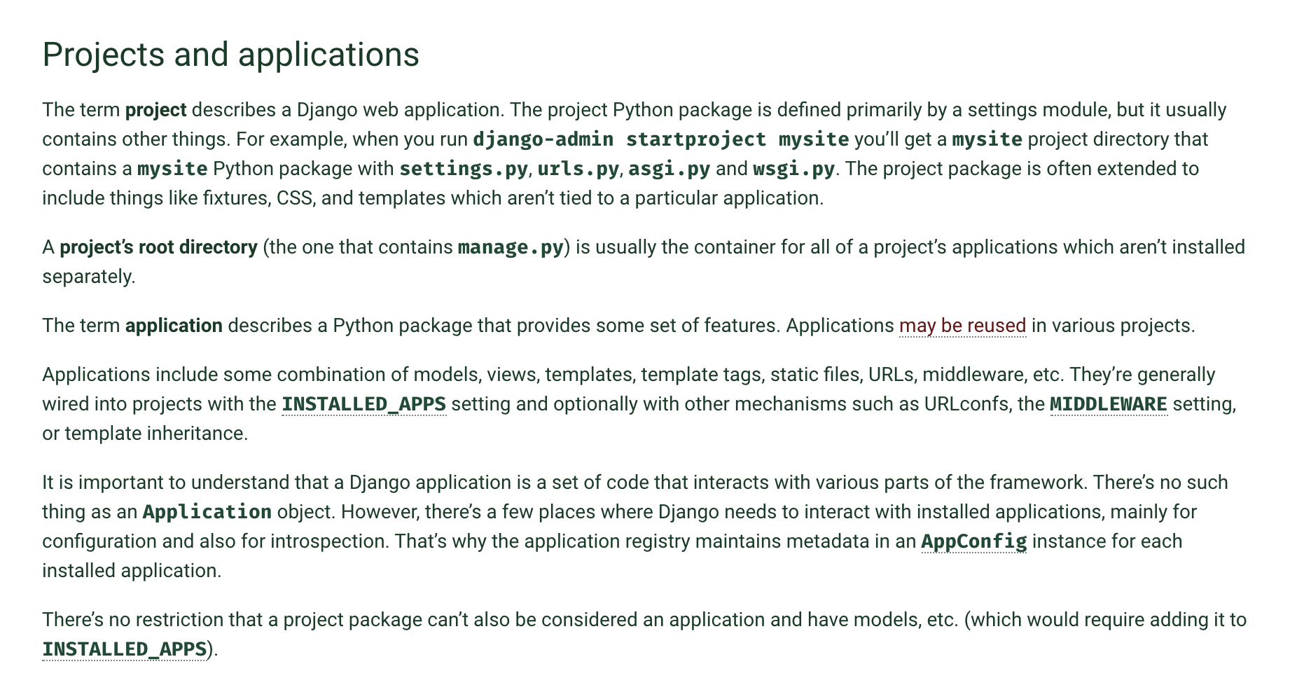 우리가 이전 포스팅에서 만든것은 프로젝트 Project 이다. PMP 자격 시험을 본 적이 있거나 프로젝트 관리에 대한 수업을 들어 보았다면 프로젝트는 여러개의 서브 프로젝트로 나뉘어 질 수도 있고, 프로젝트들이 모여서 프로그램을 이루고 어쩌고 하는 이야기들을 들어보았을 것이다. 장고에서도 동일한 개념일까? 이럴때에는 가장 좋은 것이 공식 문서를 보는 것!