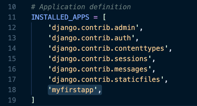 이 파일 안에는 여러가지 설정 값들이 있다. 쉽게 생각하면 장고 웹 프로젝트가 구동되는데 필요한 각종 값들 (경로, 패키지 네임스페이스 등) 을 가지고 있는 파일이다. 새로 추가한 어플리케이션을 프로젝트가 인식하려면 settings.py 에 추가되어야 하는 것이라는 감이 왔을 것이다. 빈 줄과 주석을 모두 제거하면 위와 같은 형태가 되는데, 11행에 있는 <INSTALLED_APPS> 가 우리의 퀘스트다.