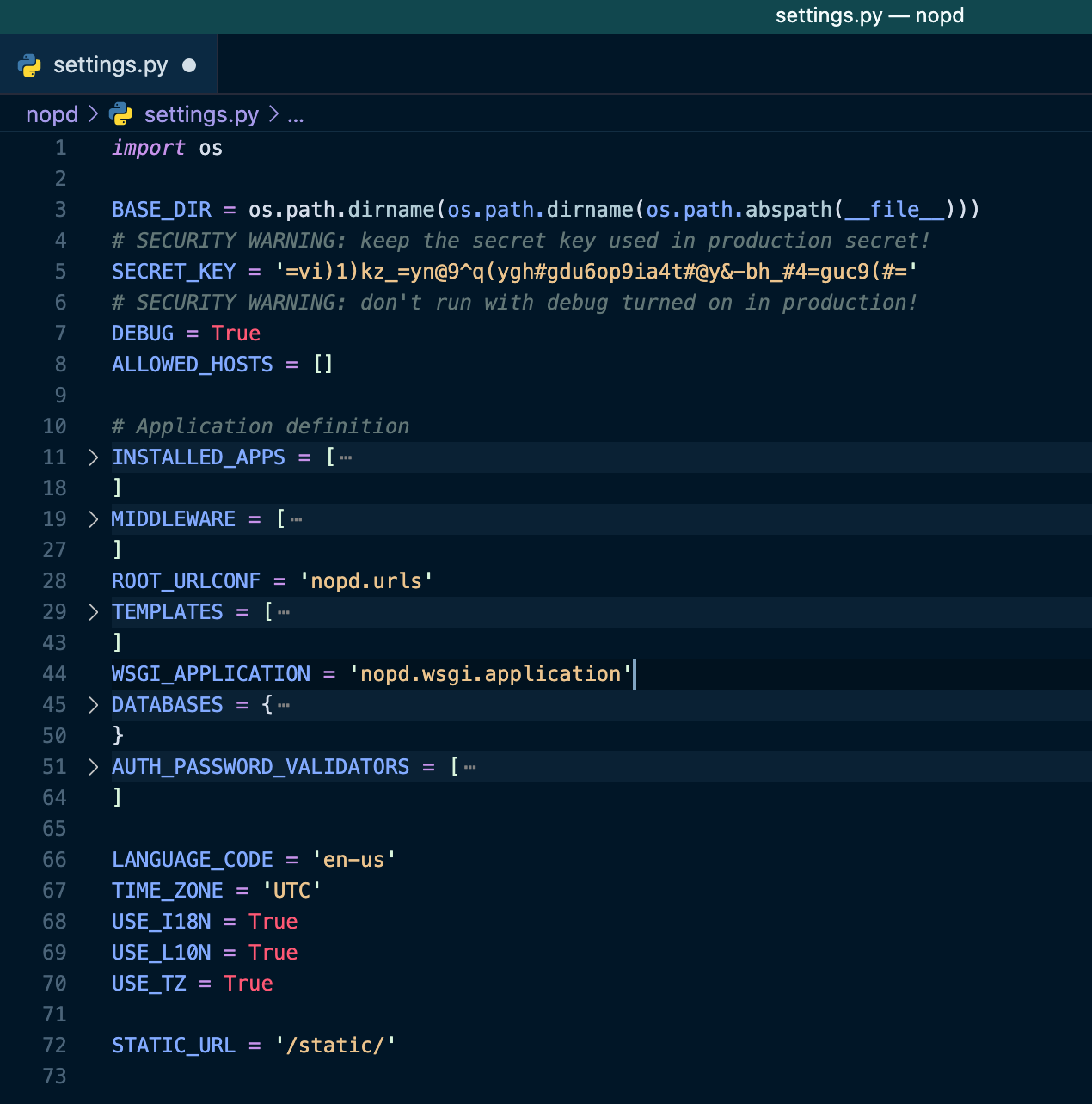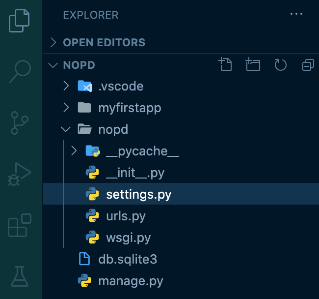NoPD 는 친절하기 때문에 다시 한 번 이미지를 첨부했다. 처음 프로젝트를 생성했을때 프로젝트 이름과 동일한 디렉토리가 하위에 하나 더 만들어졌던 것을 기억 할 것이다. 기억이 안나도 기억 난다고 생각하자. 이 경로에 들어가면 settings.py 가 보인다. 대략 자동 생성된 파일들의 위치로 유추해 보건데, (필자 기준으로) nopd 경로 하위에는 프로젝트의 구성요소나 자원에 대한 정보들이 담기고, 각 어플리케이션 하위에는 어플리케이션과 관련된 설정 등이 들어가는 모양이다. (이렇게 자신있게 말하면 안되는데...)