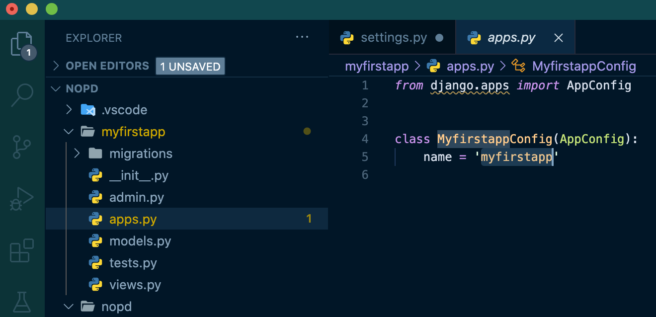 INSTALLED_APPS 에는 프로젝트가 사용하는 어플리케이션들이 등록되어 있다. 기본적으로 장고가 제공하는 admin, auth 등 6가지가 추가되어 있는 것이 보인다. 마지막에 한줄을 추가하여 우리의 어플리케이션을 추가해주고 싶은데... 어떤 값을 넣어야 하는 것일까? 다시 우리가 만든 어플리케이션 디렉토리로 이동하여 하위에 생성된 apps.py 를 열면 답이 있다.
