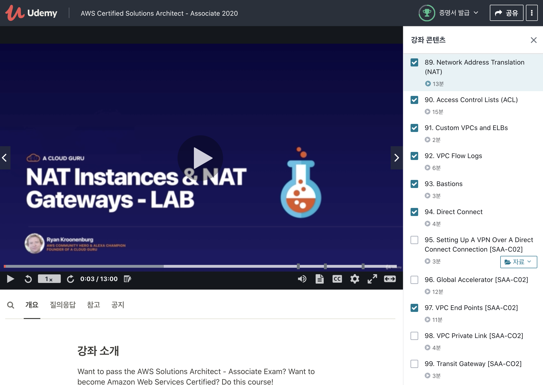 (2021.08 업데이트) Cloudguru가 Pluralsight에 인수되면서 강의들이 Udemy에서 일단 다 빠진 것 같습니다. 그 다음으로 대권(?)을 잡은 강의를 추천해 드립니다! Cloudguru의 Ryan님이 미국 스타일의 발음으로 유쾌한 강의를 해주었다면, Stephane님의 아래 강의는 제2외국어로 영어를 배운 사람의 느낌으로 조금 더 편안한(?) 발음으로 강의를 해주고 있습니다. 그래도 꼼꼼히 시험에 필요한 것들과 AWS의 기초 지식을 잘 챙겨주고 있다는 점에서는 동급 최강이라 하겠습니다! 2021년 버전으로 업데이트가 되었으니 한 번 살펴보시기 바랍니다!
