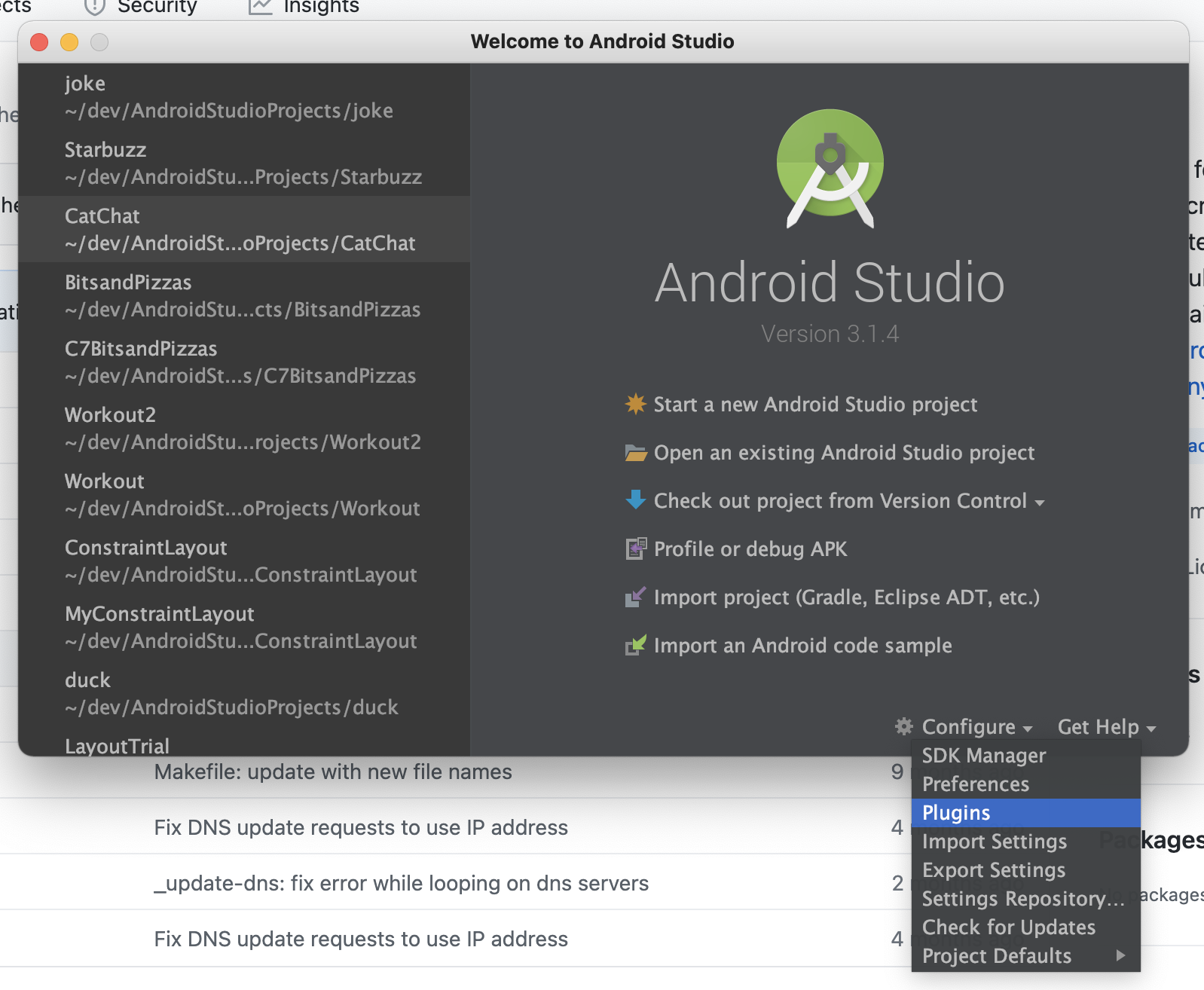 안드로이드 스튜디오를 실행하고 우측 하단의 <Configure>를 눌러 <Plugins>를 선택합니다. 플러그인 추가를 통해 플러터를 안드로이드 스튜디오에서 사용할 수 있게 됩니다. 플러그인을 선택하고 검색창에 flutter를 검색했더니...