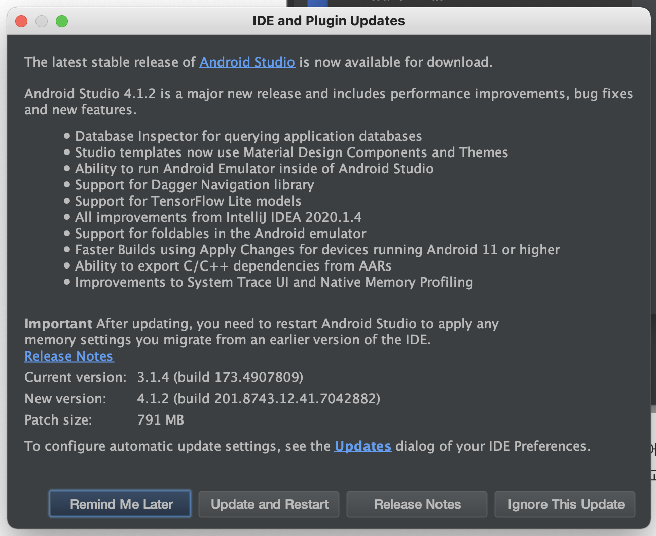 다행히 용량이 그리 크지 않네요. 최신버전과는 메이저 버전 넘버가 차이날 정도로 시대에 뒤떨어져 있는 안드로이드 스튜디오를 가지고 있었군요. 과감히 <Update and Restart>를 눌러 업데이트를 진행합니다. 자바도 업데이트하고... 여러가지로 컴퓨터가 고생을 합니다.