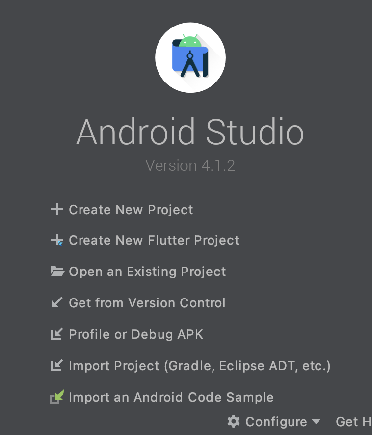 안드로이드 스튜디오가 재기동되고 나니 이전에 없었던 옵션이 하나 생긴 것이 보입니다. 바로 <Create New Flutter Project> 입니다! 감동적인 순간입니다. 드디어 플러터 프로젝트를 만들고 코드를 개발할 수 있는 준비가 되었습니다!