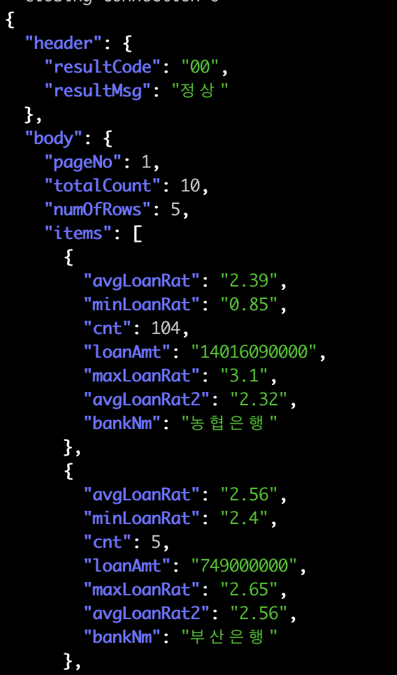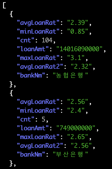 API의 자세한 스펙도 살펴보면 좋겠지만 우리의 목적은 흥미로운 JSON을 jq로 다뤄보는 연습을 하는 것이니 규격에 대한 설명은 생략하도록 하겠습니다. 요지는 JSON으로 동일한 속성을 가진 여러벌의 JSON 데이터가 나온다는 점입니다. 2021년 7월의 전세자금대출 정보를 쿼리해보니 은행별로 최저, 최대 금리가 나오고 대출 횟수가 같이 나옵니다.