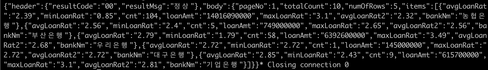 curl -v "http://apis.data.go.kr/B551408/rent-loan-rate-multi-dimensional-info/dimensional-list?serviceKey=##공공데이터포털에서_키를받아_넣으세요!##&loanYm=202105&cbGrd=1&debt=11&numOfRows=5&pageNo=1&dataType=json" | jq '.body'