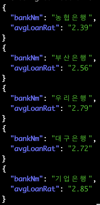 jq '.body.items[] | { bankNm, avgLoanRat }'