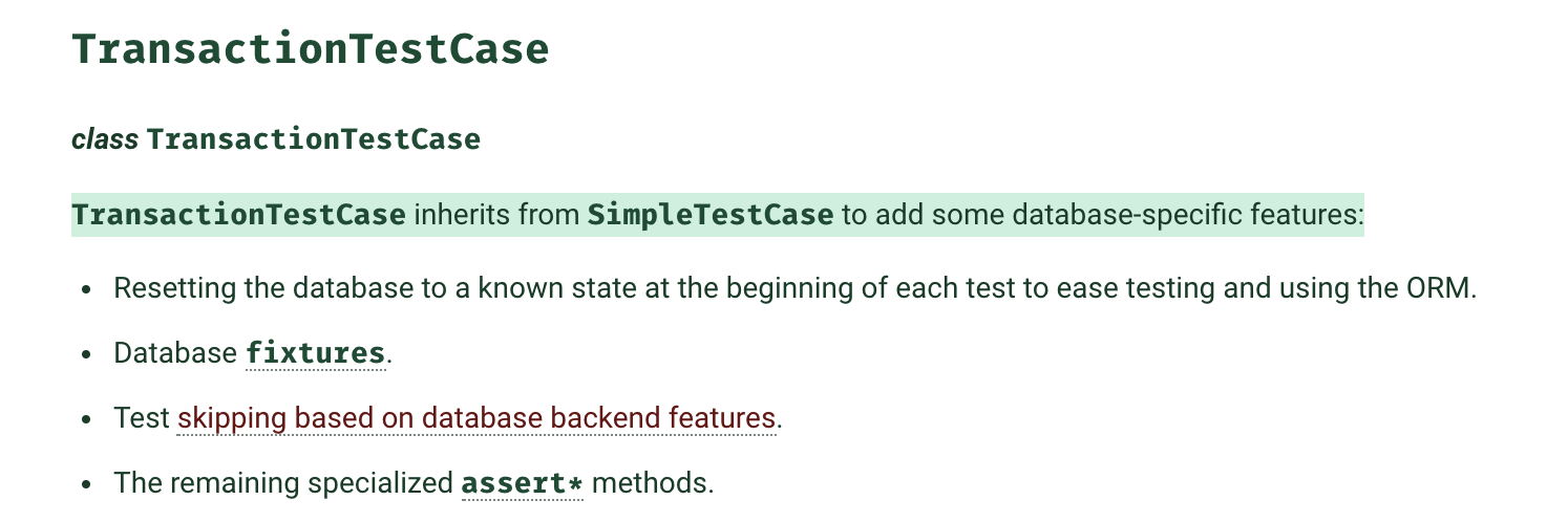 이 에러 메세지가 참 얄미운게 내용이 좀 뭉뚱그려져 있습니다. 굉장히 명확한 에러이기 때문에 TestCase 클래스를 트랜잭션을 지원하는 것으로 변경하라고 하면 되었을 것을 저렇게 표현하고 있어서 애를 먹게 만들더군요. 이 문제에 대한 첫번째 접근은 장고 공식문서에서 가이드하는 TransactionTestCase 클래스의 사용입니다.
