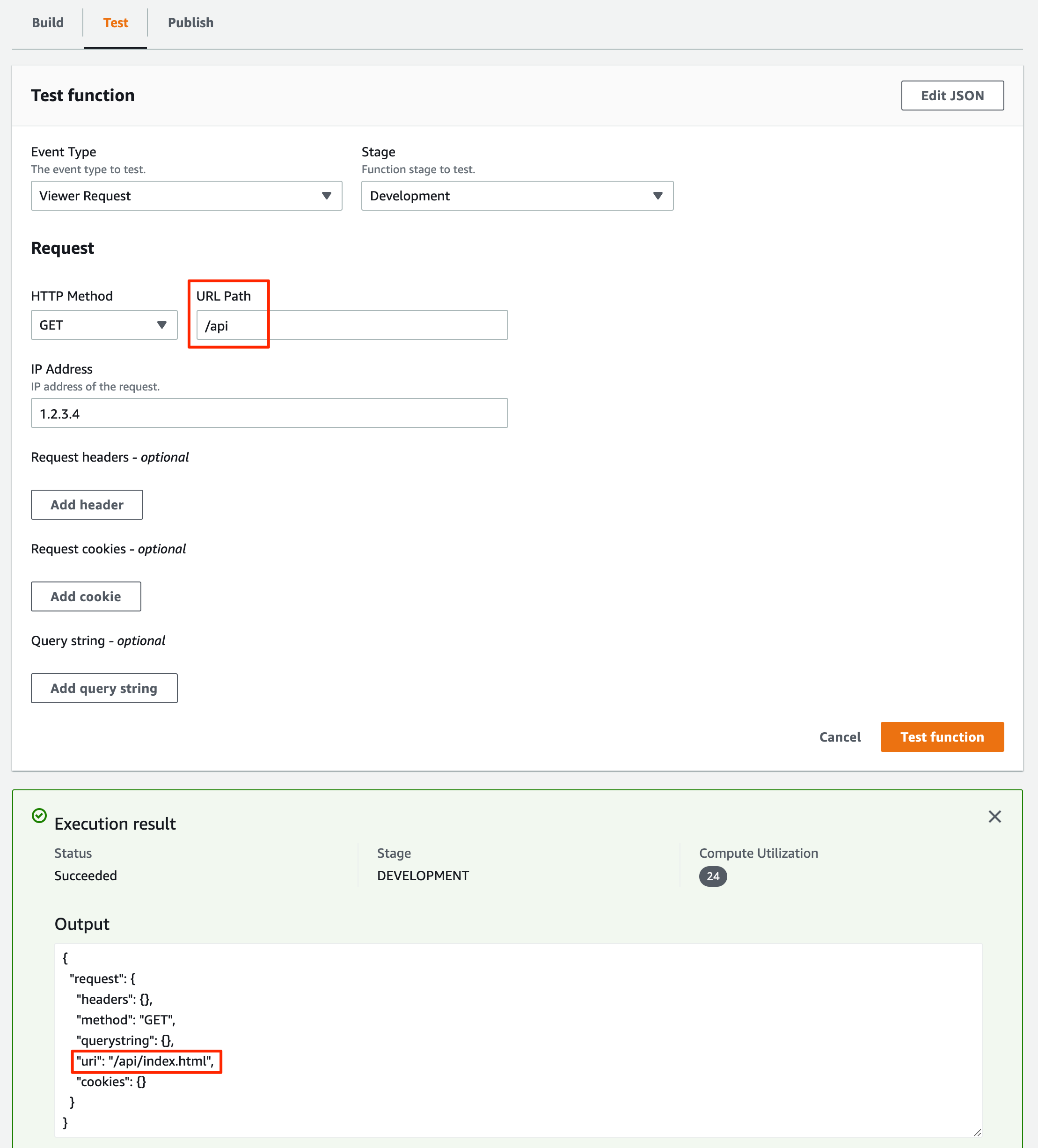 테스트도 참 쉽죠? 원하는 결과를 테스트를 통해 얻었다면, 만든 함수를 적용하고자 하는 Distribution의 Behavior의 Viewer Request 함수로 지정하면 됩니다. 끝!