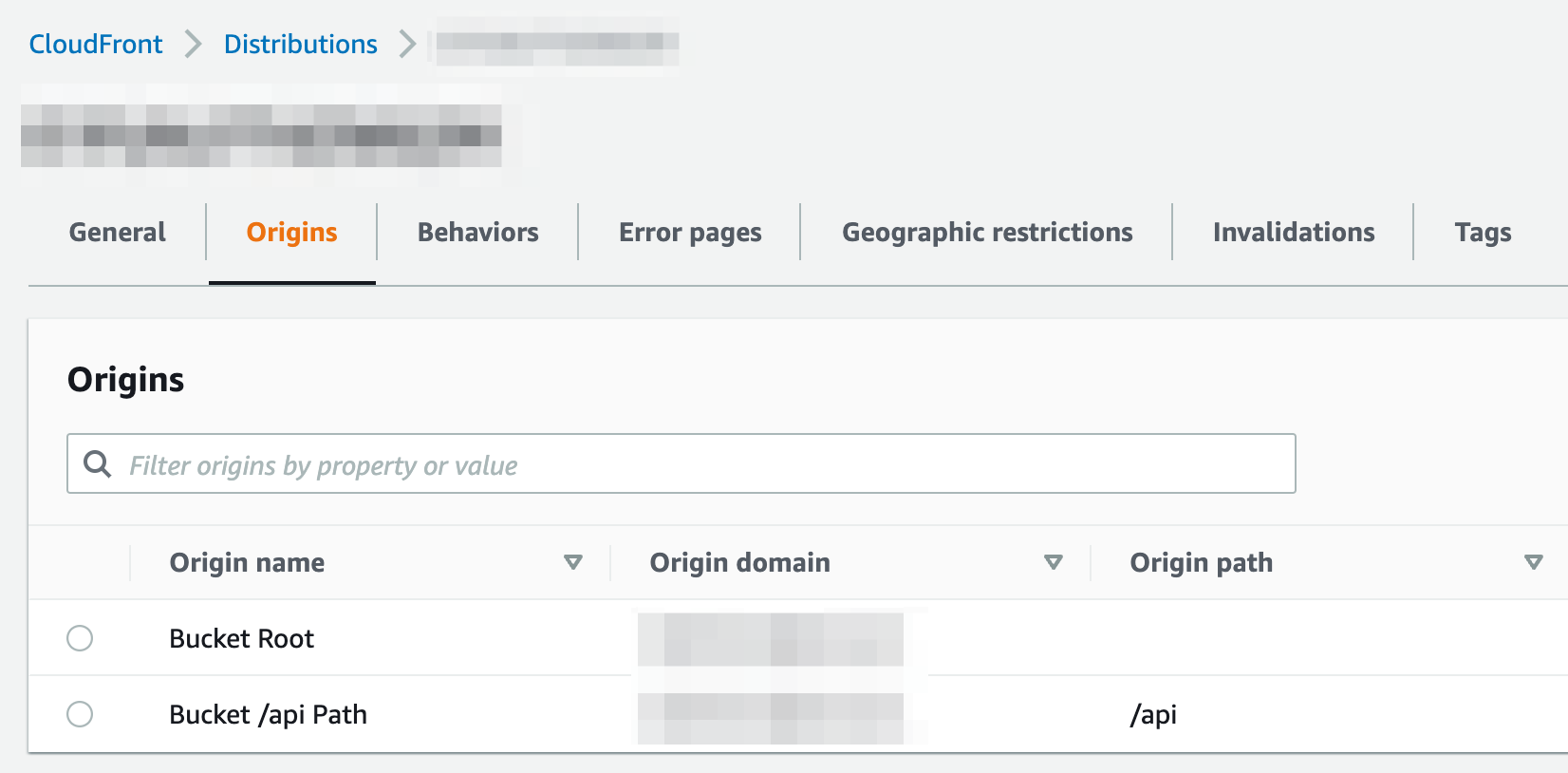원본의 서로 다른 경로를 특정 사용자 Path의 루트로 바인딩 하기 위해서는 (아시겠지만) 아래와 같이 동일 원본을 Origin Path만 분기하여 등록하면 됩니다. 이 구성과 Default root object 의 조합은 /api 경로에 대해서 적용되지 않는다는 상황으로 이해하지면 될 것 같습니다. 그러면 어떻게 하면 될까요?