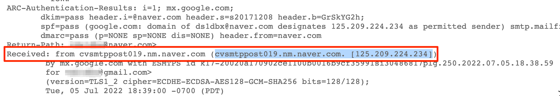 구글 메일 서버가 정말로 네이버 메일 서버를 통해 발송된 것인지