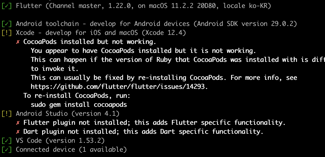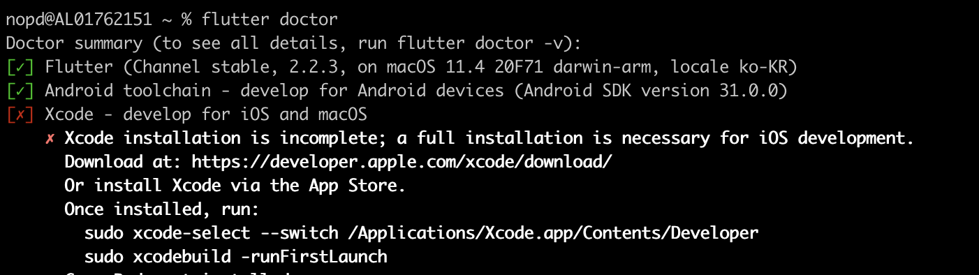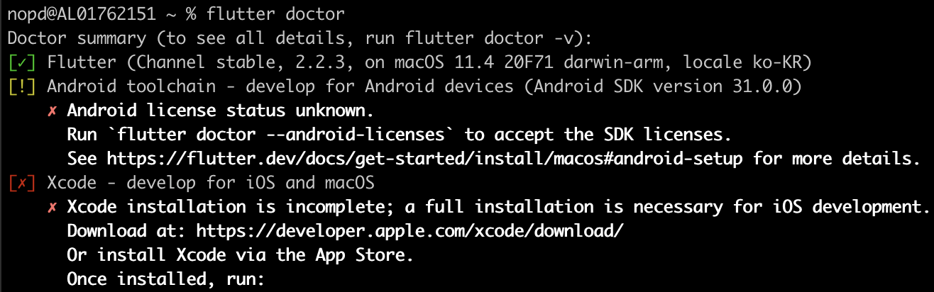 플러터 환경설치시 활용하게 되는 닥터(doctor)는 부족한 환경 설정을 쉽게 진단해주고 어떤 대응을 해야 하는지 알려주는 도구입니다. 문제는 가끔 여기서 알려준 대응 방법을 실행하는 것 자체가 문제가 되는 경우입니다. 오늘 겪은 이슈는 새롭게 플러터 환경 설정시 필요한 안드로이드 라이센스에 대한 동의 과정에서 발생했습니다.