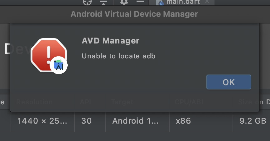 플러터(Flutter), 안드로이드 스튜디오 Unable to locate ADB 에러와 시뮬레이터가 안보이는 현상 해결하