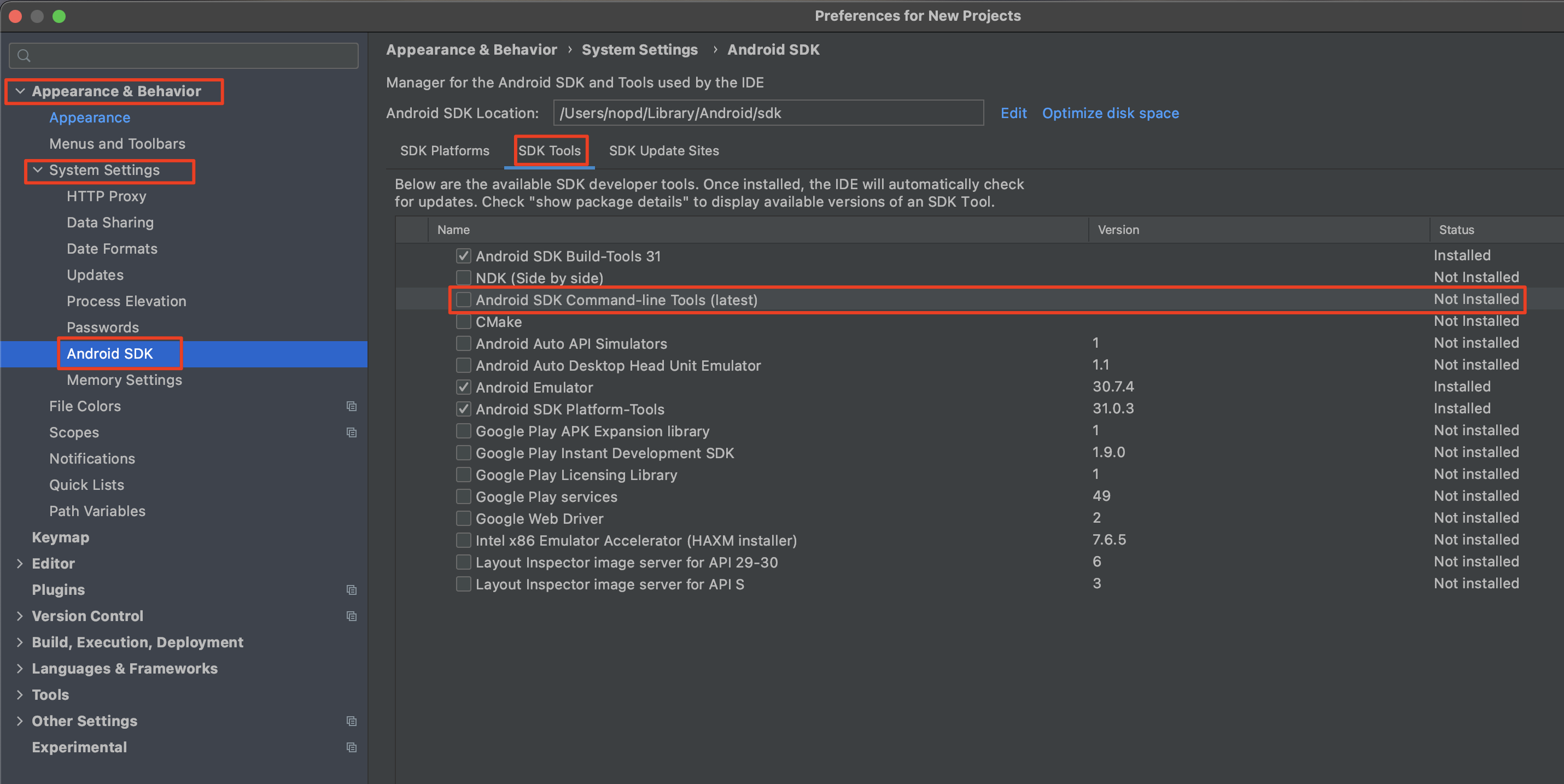 설정 화면이 열리면 <Appearance & Behavior> - <System Settings> - <Android SDK>메뉴를 선택하고 우측의 탭에서 <SDK Tools>를 선택합니다. 예상대로 커맨드라인 툴킷이 설치되어 있지 않은 것이 보입니다. 체크후 설치를 진행해 봅니다.