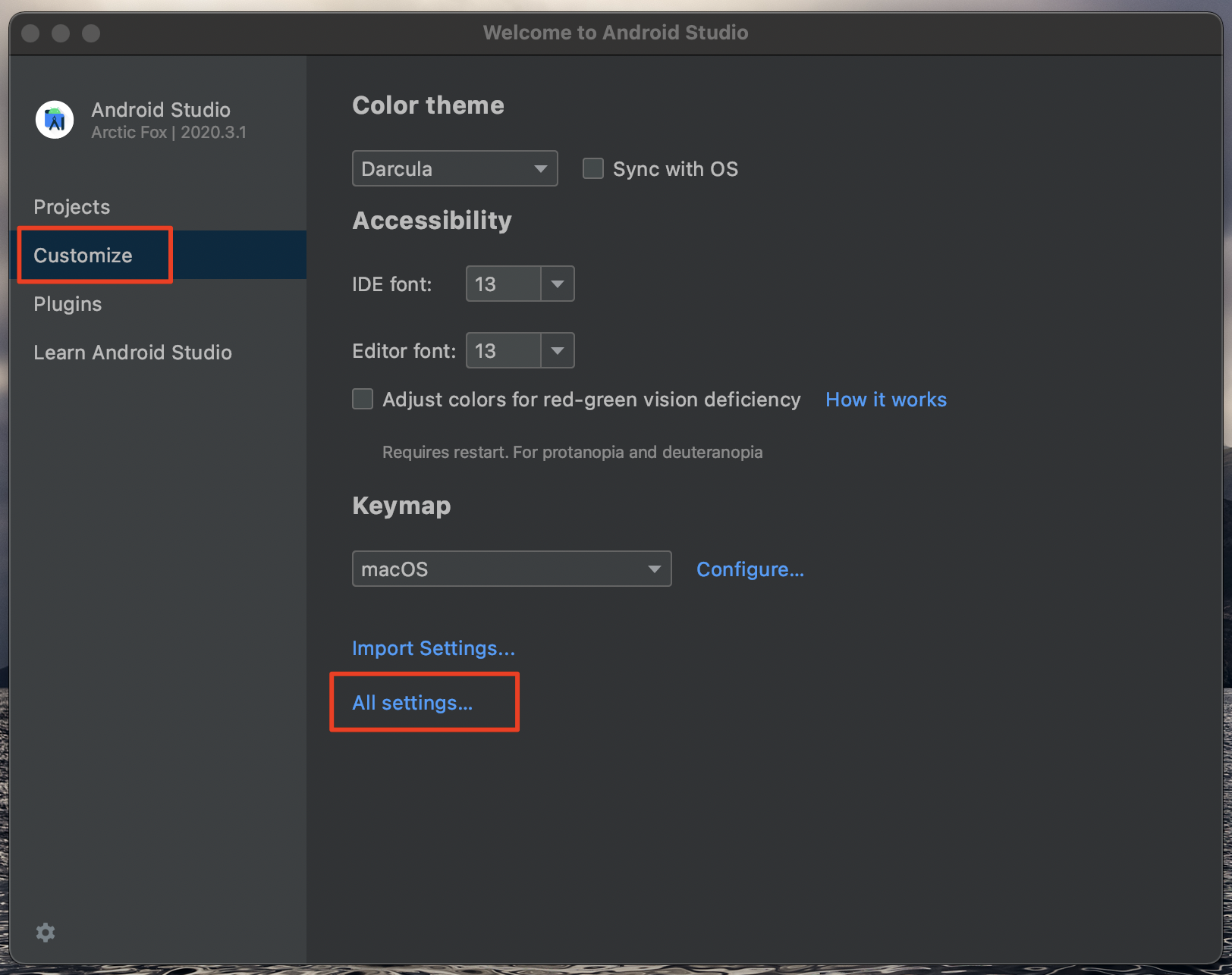 안드로이드 SDK의 커맨드라인 툴킷을 설치하는 가장 간단한 방법은 안드로이드 스튜디오의 셋팅 메뉴를 이용하는 방법입니다. 안드로이드 스튜디오를 실행하고 왼쪽 <Customize> 메뉴를 선택하면 아랫쪽에 <All settings...> 메뉴가 보입니다. 메뉴를 선택합니다.