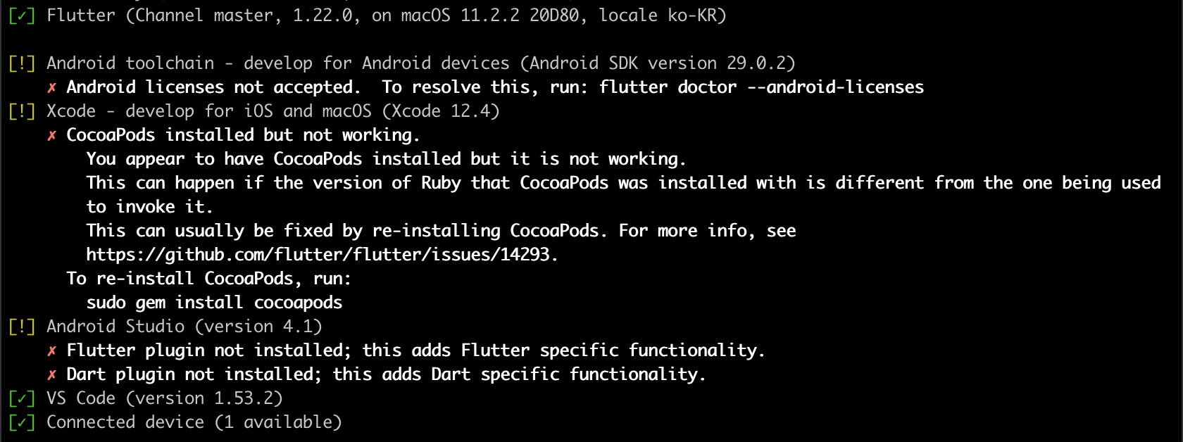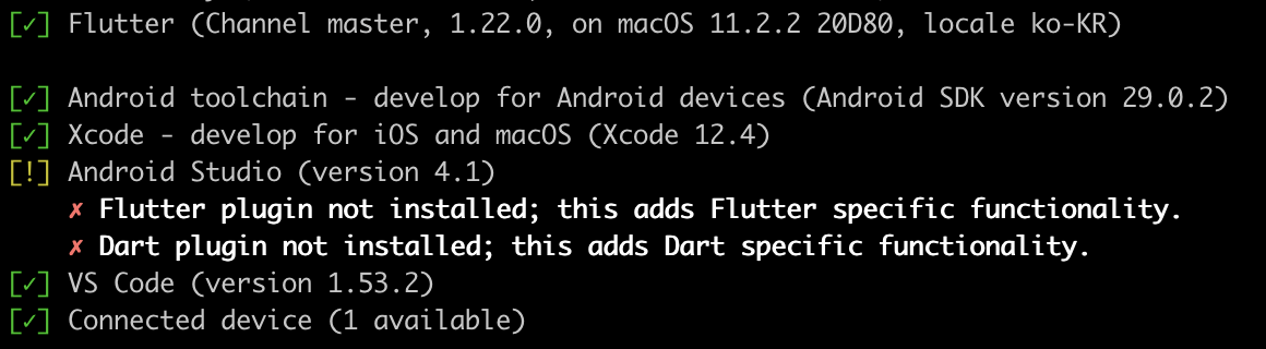 이제 다시 한 번 플러터 닥터를 수행하여 필요한 절차를 살펴보겠습니다. 에러가 표시되던 Android toolchain 항목에 그린라이트가 들어온 것이 확인되네요!