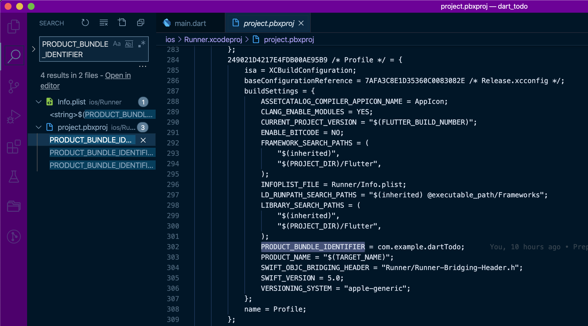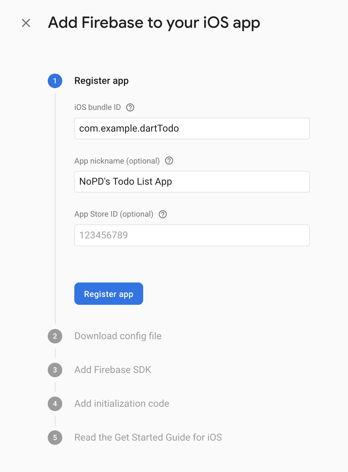 앱에서 Firebase 를 사용하기 위한 첫번째 절차는 사용할 앱의 정보를 등록하는 것입니다. iOS Bundle ID 와 닉네임, 앱스토어 ID 등의 정보를 입력해야 합니다. VS Code 를 이용해서 Flutter 를 사용하는 중인데요 VS Code 의 Explorer 에서 Shift + Command + F 를 눌러 PRODUCT_BUNDLE_IDENTIFIER 를 검색하면 Flutter 가 미리 만들어 준 iOS Bundle ID 를 찾을 수 있습니다. ID 값을 복사하여 Firebase 의 등록 화면에 입력해 줍니다.