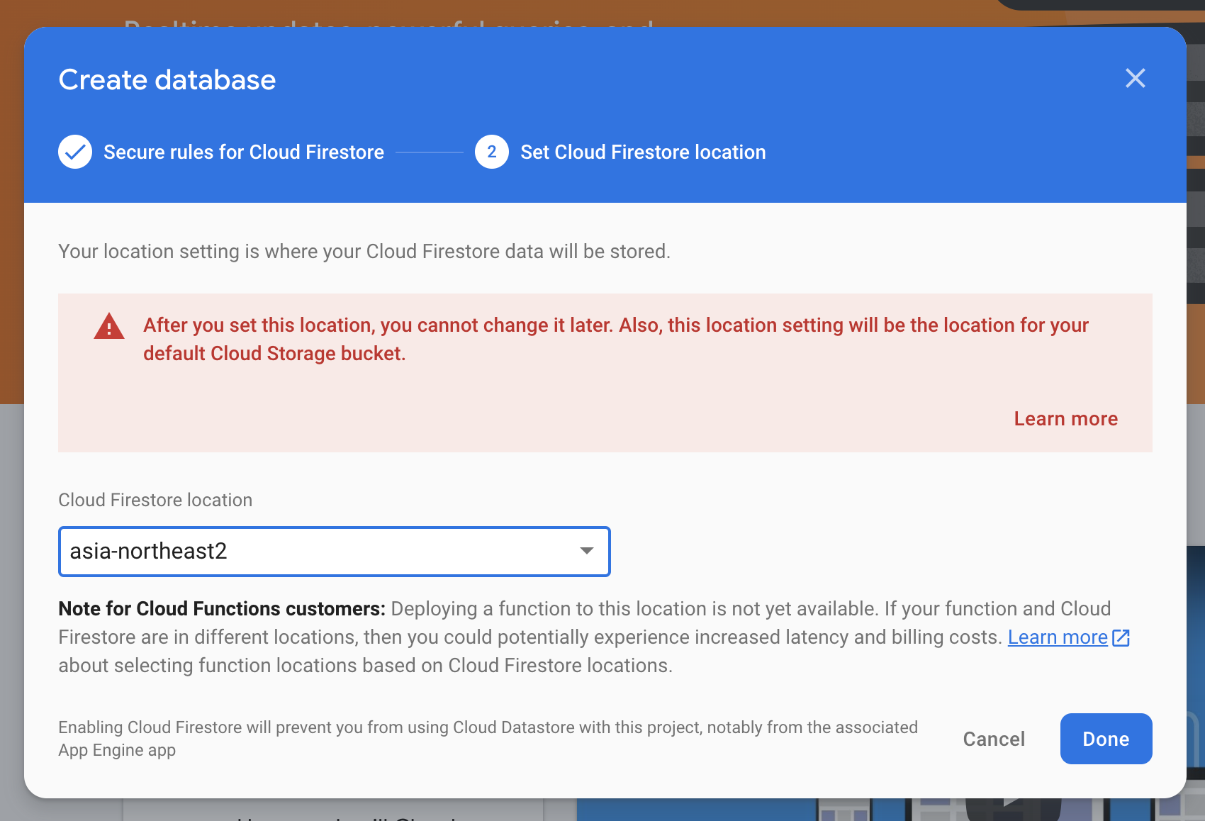 Firebase 도 여느 클라우드 서비스와 마찬가지로 여러 리전 Region 을 운영하고 있습니다. 실제 서비스에서는 응답 속도를 감안해야 하기 때문에 주요 사용자가 있는 국가, 장소를 감안하여 리전을 선택해야 하지만 지금은 어떤 것을 선택해도 크게 문제는 없으니... 임의로 선택하시고 Done 버튼을 누르겠습니다.