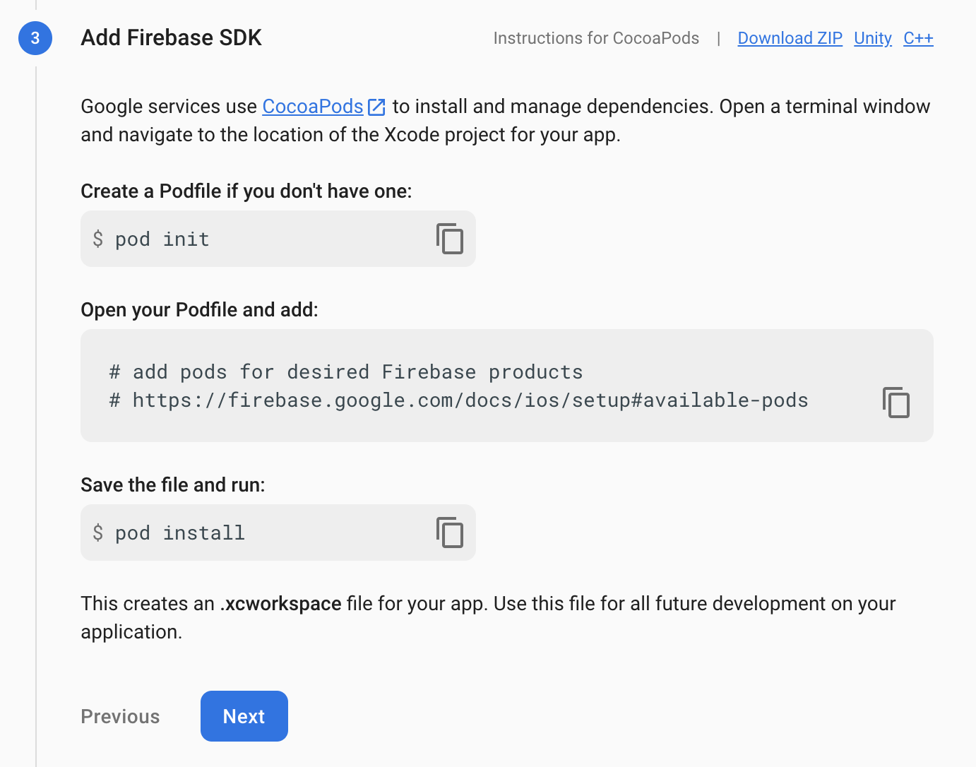 Firebase 를 위한 환경 설정 파일을 추가했으니 SDK 가 잘 설치되도록 하기 위한 CocoaPod 관련한 확인을 해봐야합니다. Firebase 는 CocoaPod 를 이용해서 의존성 관리를 하고 있기 때문에 CocoaPod 가 잘 동작하고 있어야 합니다. VS Code 에서 Flutter 프로젝트를 생성한 경우 이미 .xcworkspace 파일이 추가되어 있습니다. 따라서 아래 내용은 참고만 하셔도 무방합니다.