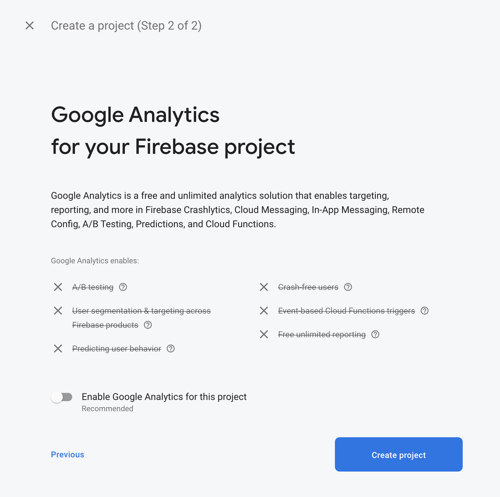 구글 애널리틱스는 사용자들의 행동 정보를 수집하는데 무척 유용한 도구입니다. 요즘은 웹 어플리케이션 뿐만 아니라 모바일 앱에서도 구글 애널리틱스를 이용하여 사용자 정보를 수집하는 경우가 많습니다. 이 포스팅은 Firebase 를 사용하기 위한 기본적인 설정 방법과 Cloud Firestore 의 셋업에 촛점을 맞추고 있으니 Enable 하지 않고 프로젝트를 생성해 보겠습니다.