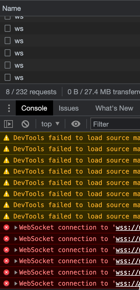웹 소켓 연결이 제대로 맺어지지 않는 문제가 있습니다.