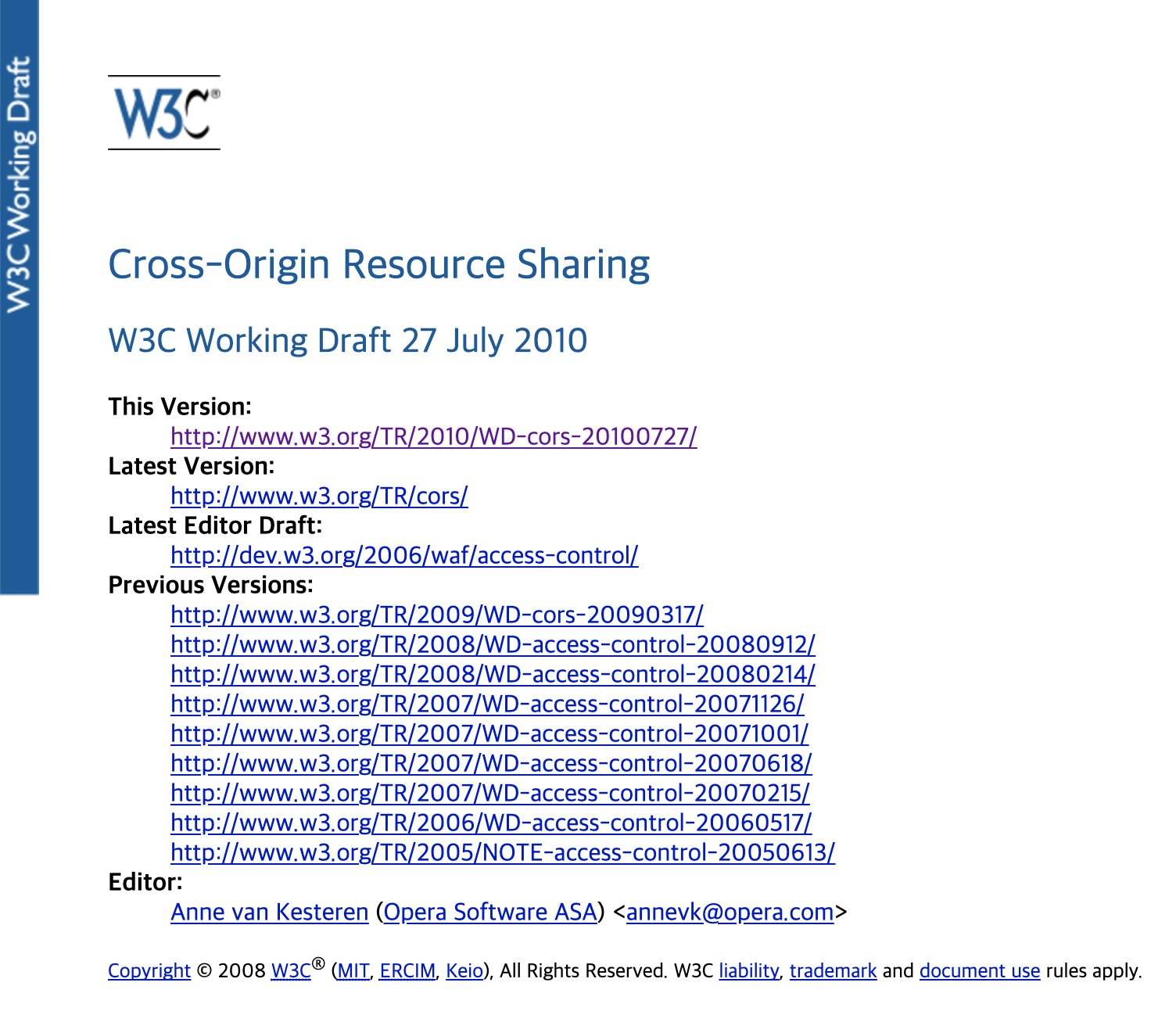 2009년경에 출시된 파이어폭스 Firefox 3.5 와 사파리 Safari 4.0 에서부터 강화된 동일 오리진 정책 SOP (Same Origin Policy) 이 적용되기 시작했고 현재 시장에서 사용되는 대부분의 브라우저는 이 정책을 준수하고 있습니다. 이 즈음부터 XHR (XML Http Request) 을 이용해 서로 다른 원본 서버에서 리소스를 <비동기> 로 가져다 쓰는 것에 대한 혼란(?)이 시작되었다고 봐도 무방합니다.