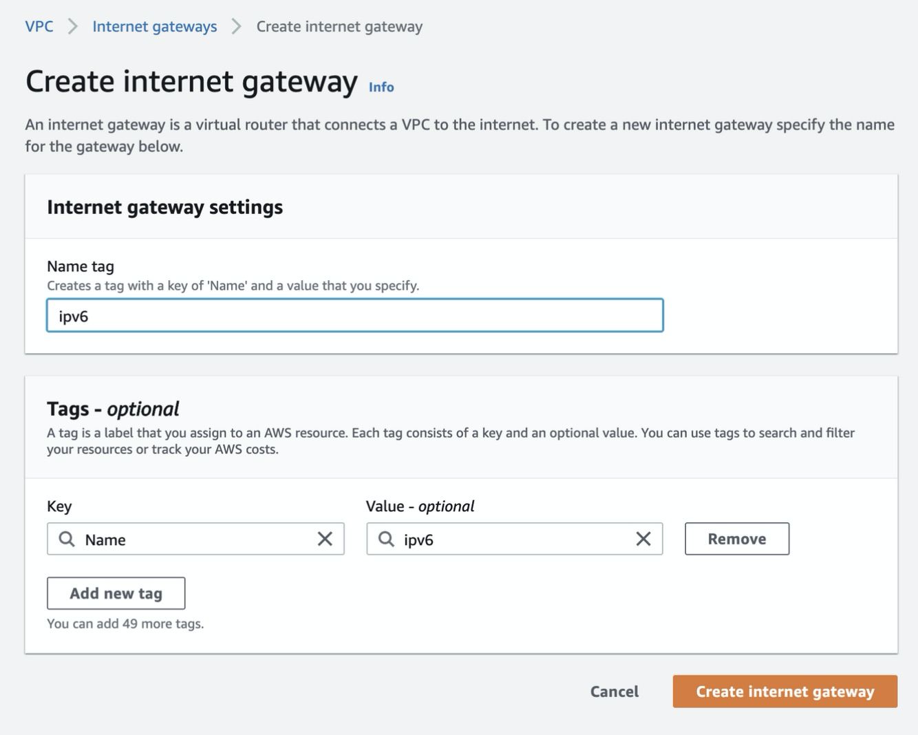 Internet Gateway 를 생성하기 위해 VPC 제품 페이지에서 Internet Gateway 메뉴로 들어갑니다. 별도의 VPC 를 만들었기 때문에 Default VPC 에 있는 Internet Gateway 를 사용할 수는 없습니다. Internet Gateway 는 VPC 단위로 연결할 수 있다는 것도 기억해 두면 좋겠습니다. 제 경우 구분을 위해 Tag 에 "ipv6" 를 넣어주었습니다.