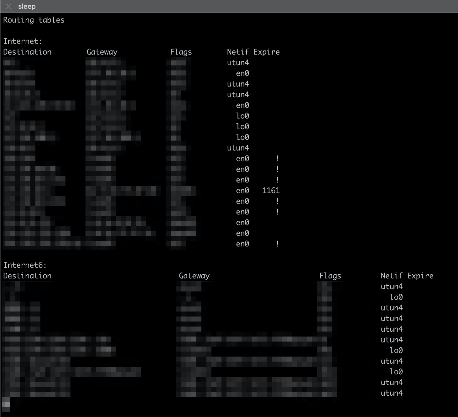 미처 캡쳐를 해두진 못했지만 netstat -nr 로 로컬의 라우팅 테이블을 살펴보니 스태틱으로 잡힌 테이블이 너무 많았습니다. VPN 연결시 생성되는 인터페이스인 utun 시리즈도 무려 6개나 존재하더군요. 인터페이스를 down 으로 하는 것과 라우팅 테이블은 별개라 한땀 한땀 삭제를 해주어야 했습니다. 사용한 명령들은 대략 아래의 패턴입니다.