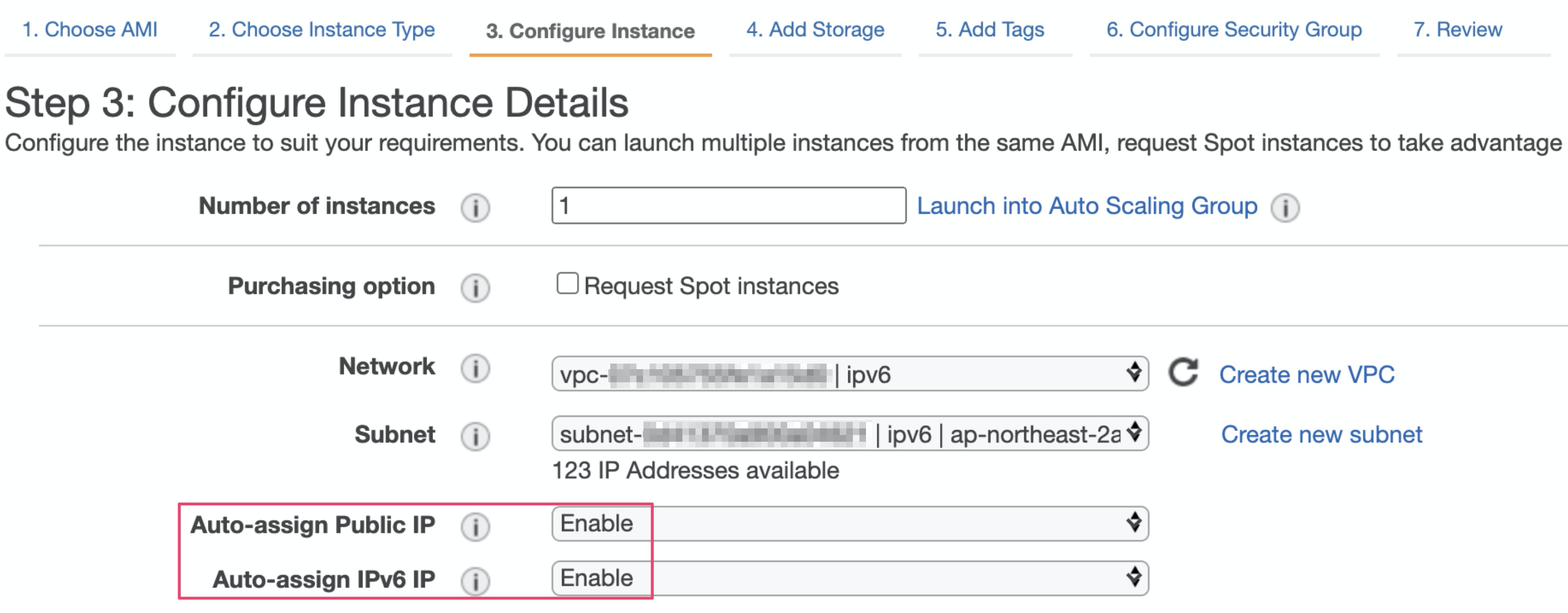 이 목적을 달성하기 위해서는 <3. Configure Instance> 단계에서 하단에 있는 <Auto-assign Public IP> 와 <Auto-assign IPv6 IP> 를 Enable 로 선택하여 v4 와 v6 를 통해 공인 IP 를 사용할 수 있도록 해야 합니다. 그런데 IPv6 는 왜 <Public> 이라는 말이 없을까요? 기본적으로 IPv6 주소 체계는 Private / Public 를 가지고 있지 않습니다. 따라서 옵션의 이름도 단순히 <Auto-assign IPv6 IP> 라고 되어 있다는 점 참고하시기 바랍니다!