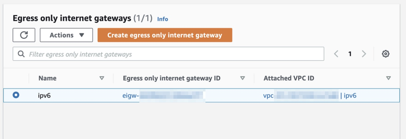 설명했던 것처럼 VPN 연결은 IPv4 로만 허용하고 터널링은 IPv6 를 쓰기 위해 Egress Only Internet Gateway 를 따로 만들어 보도록 하곘습니다. AWS 의 제품 설명 페이지를 유심히 읽어 보셨다면 아시겠지만 Egress Only Internet Gateway 는 IPv6 전용입니다. IPv4 를 터널링 한다면 Internet Gateway 만 사용하는 것으로 충분합니다.