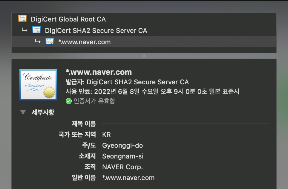 - Leaf 인증서 : 실제 도메인(예: www.naver.com)에 대해 발급된 최종 사용자용 인증서