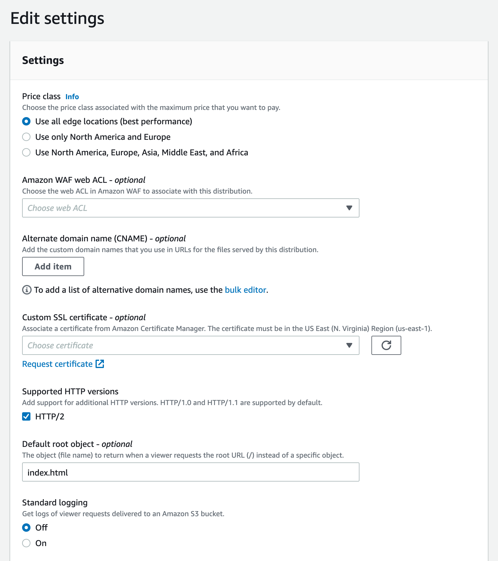 Edit 화면의 중간 정도를 살펴보면 `Default root object - optional` 항목을 찾으실 수 있습니다. 이곳에 지정된 파일 이름이 CloudFront를 통해 접근시 사용되는 기본적인 파일 이름이 됩니다. 가령 www.iamnopd.com 이라는 도메인이 있다고 가정했을 때, 브라우저에 www.iamnopd.com 만 입력해도 알아서 index.html 을 찾아 사용자 브라우저로 응답을 하게 되는 거죠.