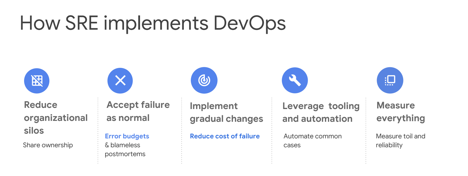 오너십의 분산, 에러 예산 내에서의 에러 수용 -> 실패 비용 줄이기, 자동화, 측정