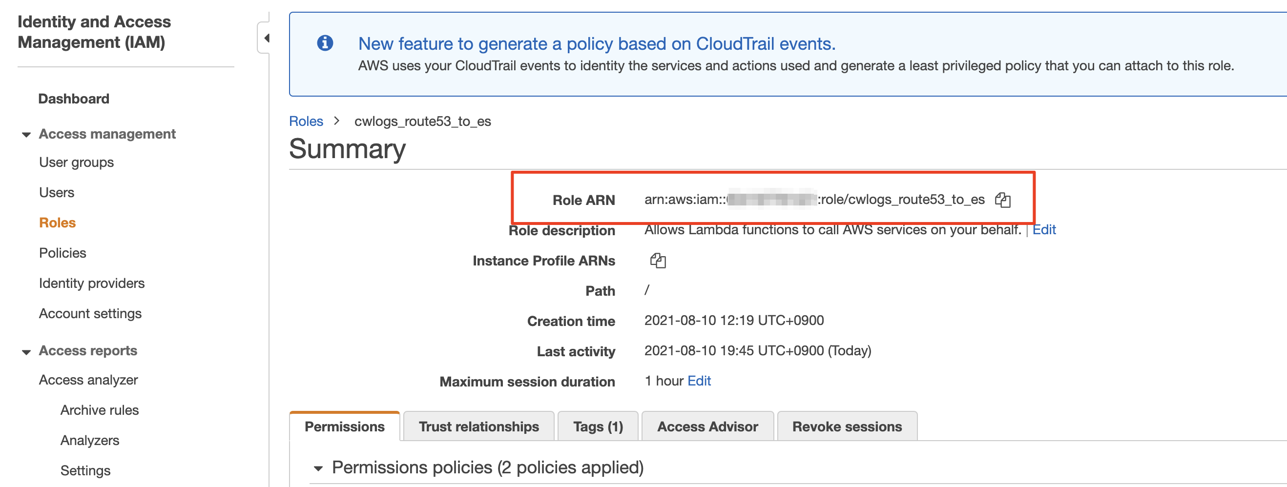여기까지 완료되었다면 IAM Role의 설정이 완료된 것입니다. 다시 CloudWatch Logs에서 subscription filter를 선택하던 화면으로 돌아가서 Lambda IAM Execution Role 지정 영역의 Refresh 를 눌러 방금 만든 Role이 나오는지 확인합니다. 저는 기억하기 좋게 cwlogs_route53_to_es 라고 Role 이름을 지었습니다. 생성한 Role을 선택후 다음 섹션으로 넘어가겠습니다.