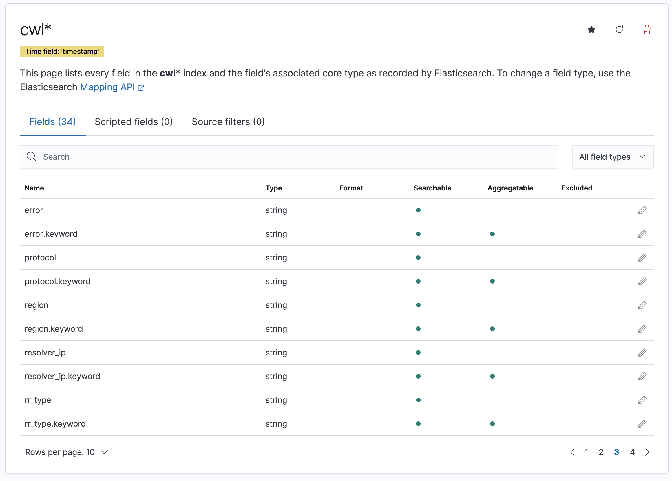 안타깝게도 사전에 정의된 Log format 목록에는 Route53이 CloudWatch Logs를 통해 전달하는 포맷 정보가 기본 항목으로 들어 있지 않습니다. 따라서 Log format으로 `Space Delimited`를 선택하고 2021년 8월 기준 로그에 대해서 만든 아래의 내용을 필터 패턴에 넣어주면 ElasticSearch Cluster에서 사용하기 편한 컬럼을 만들고 저장할 수 있게 됩니다.