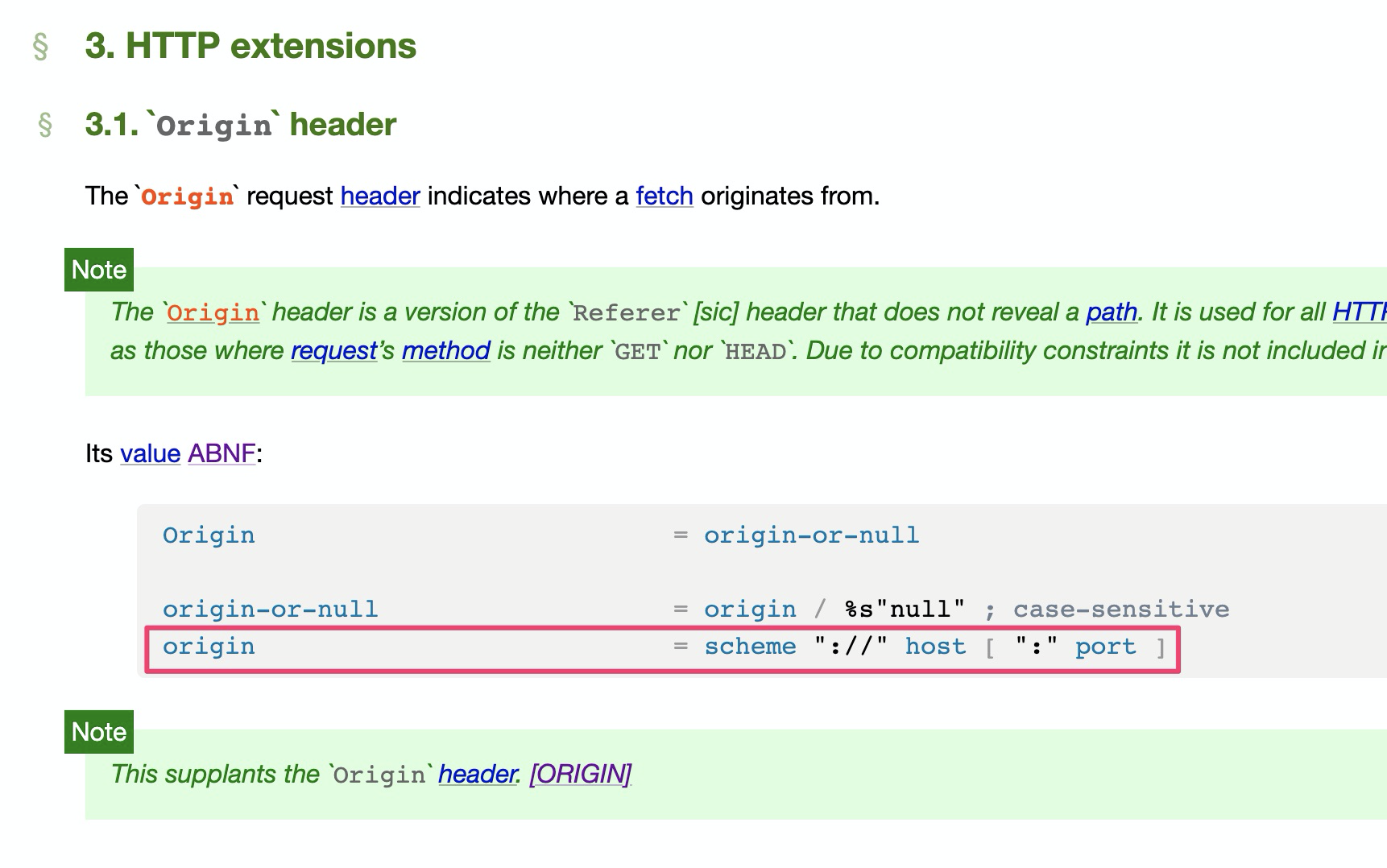그런데 말입니다, 모질라의 CORS 문서에서 발췌한 위의 내용은 한가지가 잘못되어 있습니다. RFC 의 규격 문서에 따르면 Origin 헤더의 값은 반드시 스킴 Scheme (http 혹은 https) 을 포함해야만 합니다. 위의 그림처럼 `Origin: foo.example` 로 던지면 규격에 대한 위반이 되게 됩니다. 왜냐하면 http://foo.example 과 https://foo.example 은 서로 다른 Origin 으로 활용될 수 있기 때문입니다. WHATWG 의 규격 문서를 보면 이 헤더의 규격은 아래와 같습니다.