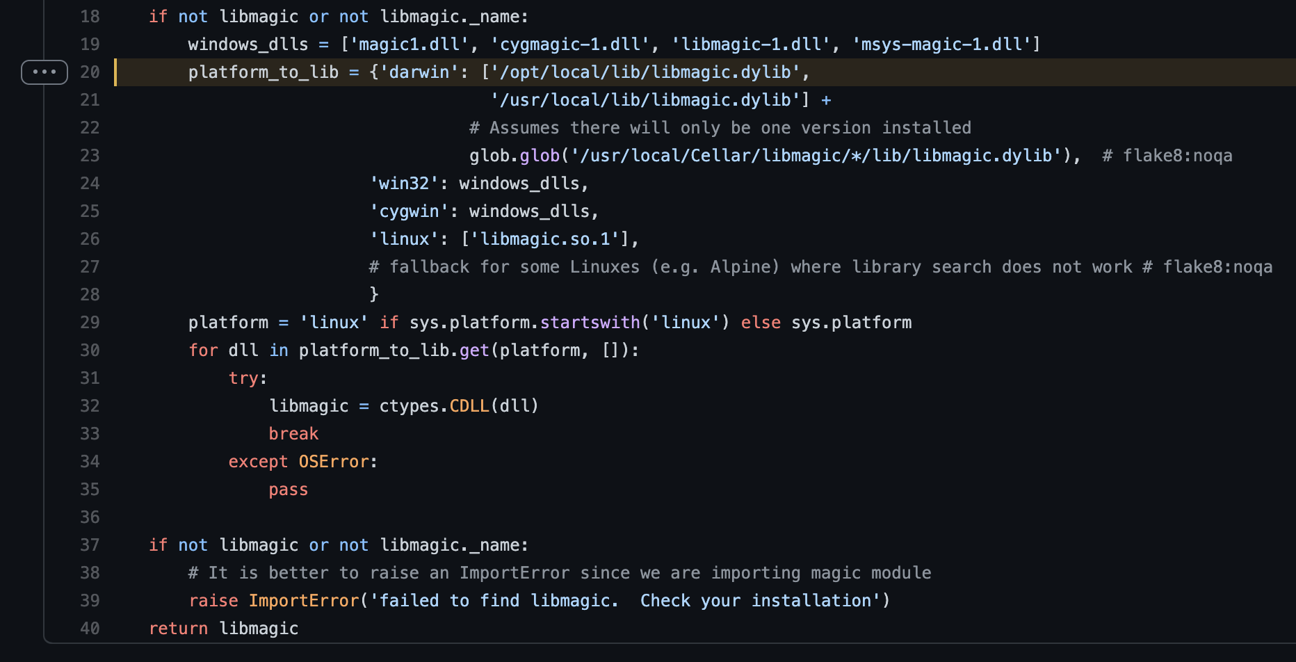python libmagic 패키지가 운영체제의 libmagic 라이브러리를 참조하는 코드는 하드 코딩된 몇 가지 절대 경로를 탐색하도록 만들어져 있었습니다. 그 경로중 하나는 바로 brew가 인텔과 애플실리콘 환경에서 변화가 생긴 바로 그 경로였습니다. 오우... 코드에 기여할 수 있는 것인지 혹은 이미 이슈가 올라왔는지...는 조금 후에 생각하기로 하고 libmagic의 설치 경로를 확인해보고 symlink를 만들어 추정이 맞는지 시험해 보기로 했습니다.