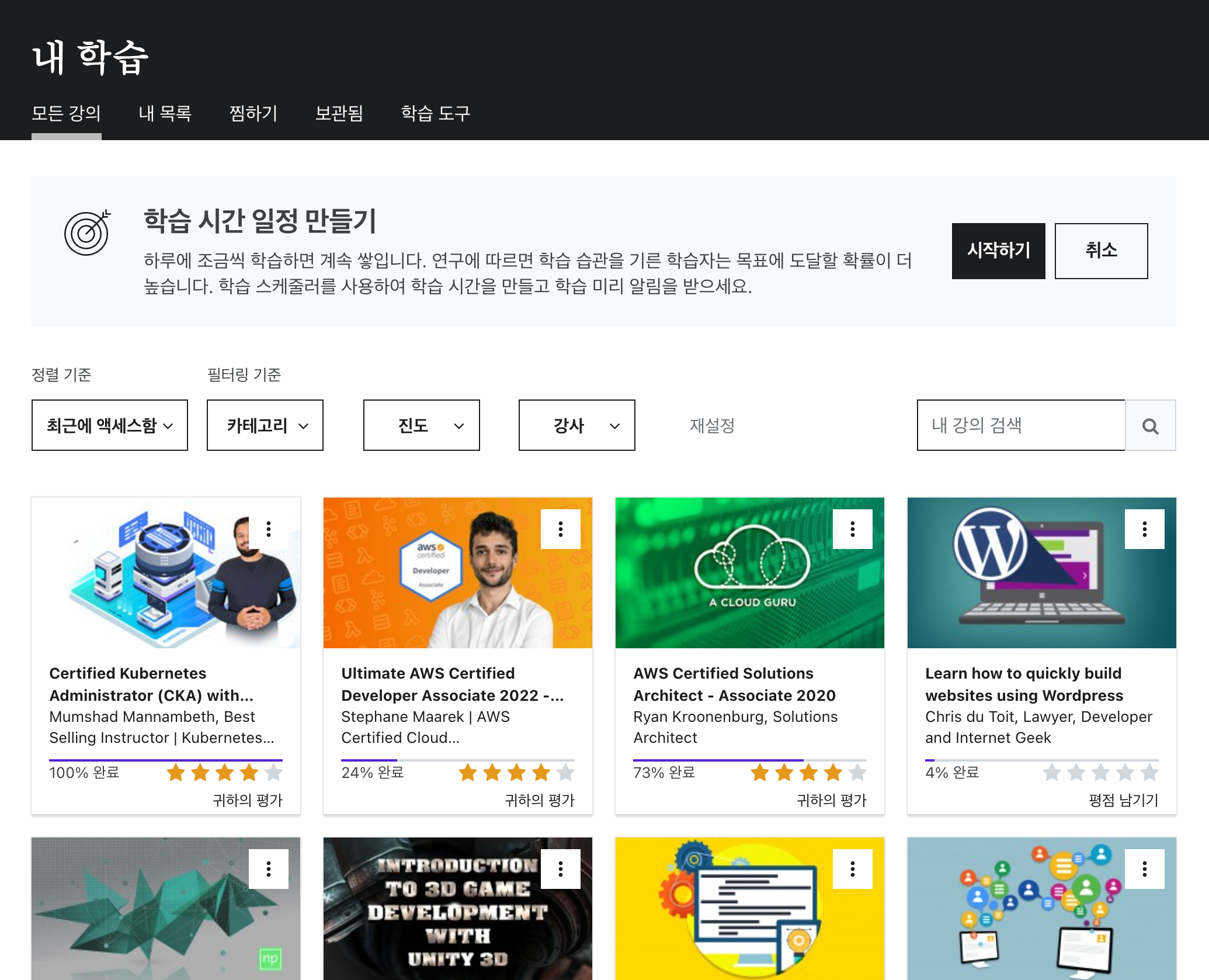 2021년 마지막 날까지 열심히 CKA 강의를 들었습니다. 진도율 100% 채우고 이제 Kode Kloud 에서 랩 실습과 함께 모의 시험을 가지고 연습하는 중입니다.
