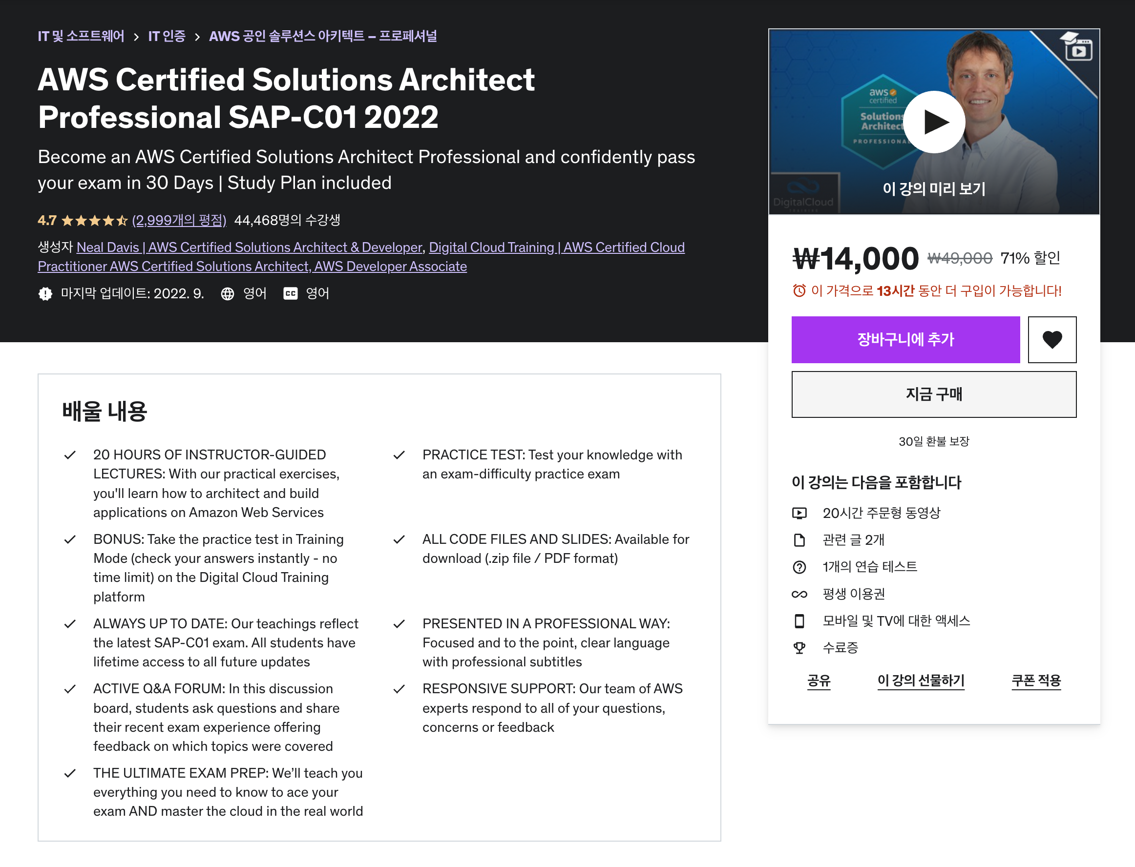 고심끝에 고른 강의는 Neal Davis님의 SAP 강의 일단 20시간 VOD라 짧고 굵게 공부할 수 있을 것 같고 본인이 운영하는 Digital Cloud Training 이라는 서비스에서 실습할 수 있는 환경을 제공해 주는 것 같아 과감히 선택했습니다.